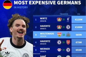 德轉(zhuǎn)列德國(guó)籍球員歷史轉(zhuǎn)會(huì)費(fèi)榜:歐元